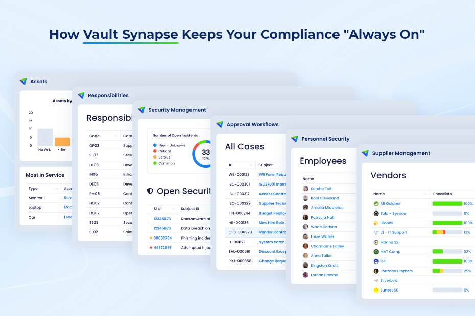 Don’t let manual spreadsheets and fragmented data jeopardize your next audit. Experience how a centralized, modular system can transform your compliance from a headache into a competitive advantage with Vault Synapse. Get in touch for your 30-day free trial today.